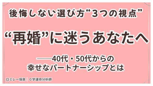 40代・50代で再婚を考えるとき、「今度こそ幸せになりたい」と慎重になるのは当然のこと。そこで、大切なのは“自分の本音”に気づくことです。0学運命分析の視点から、後悔しない再婚のために見つめておきたい3つのポイントをお届けします。